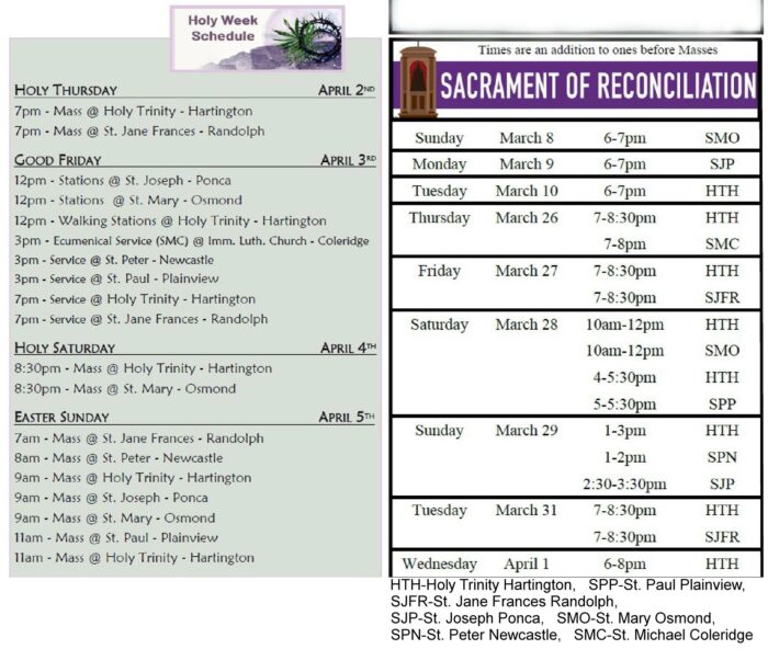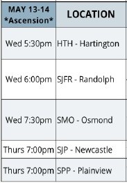 HTH-Holy Trinity Hartington, SPP-St. Paul Plainview, SJFR-St. Jane Frances Randolph,